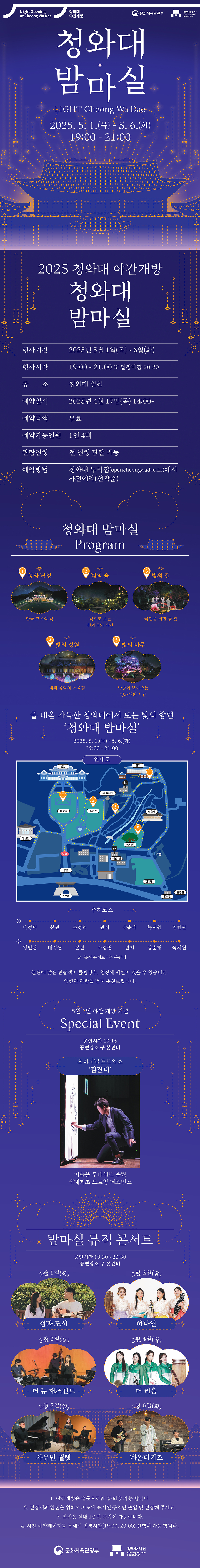 주최 측은 “청와대는 더 이상 먼 권력의 상징이 아닌, 국민과 함께하는 문화 공간으로 자리매김하고 있다”며, “밤이라는 특별한 시간 속에서, 청와대의 또 다른 얼굴을 만나보시길 바란다”고 전했습니다.